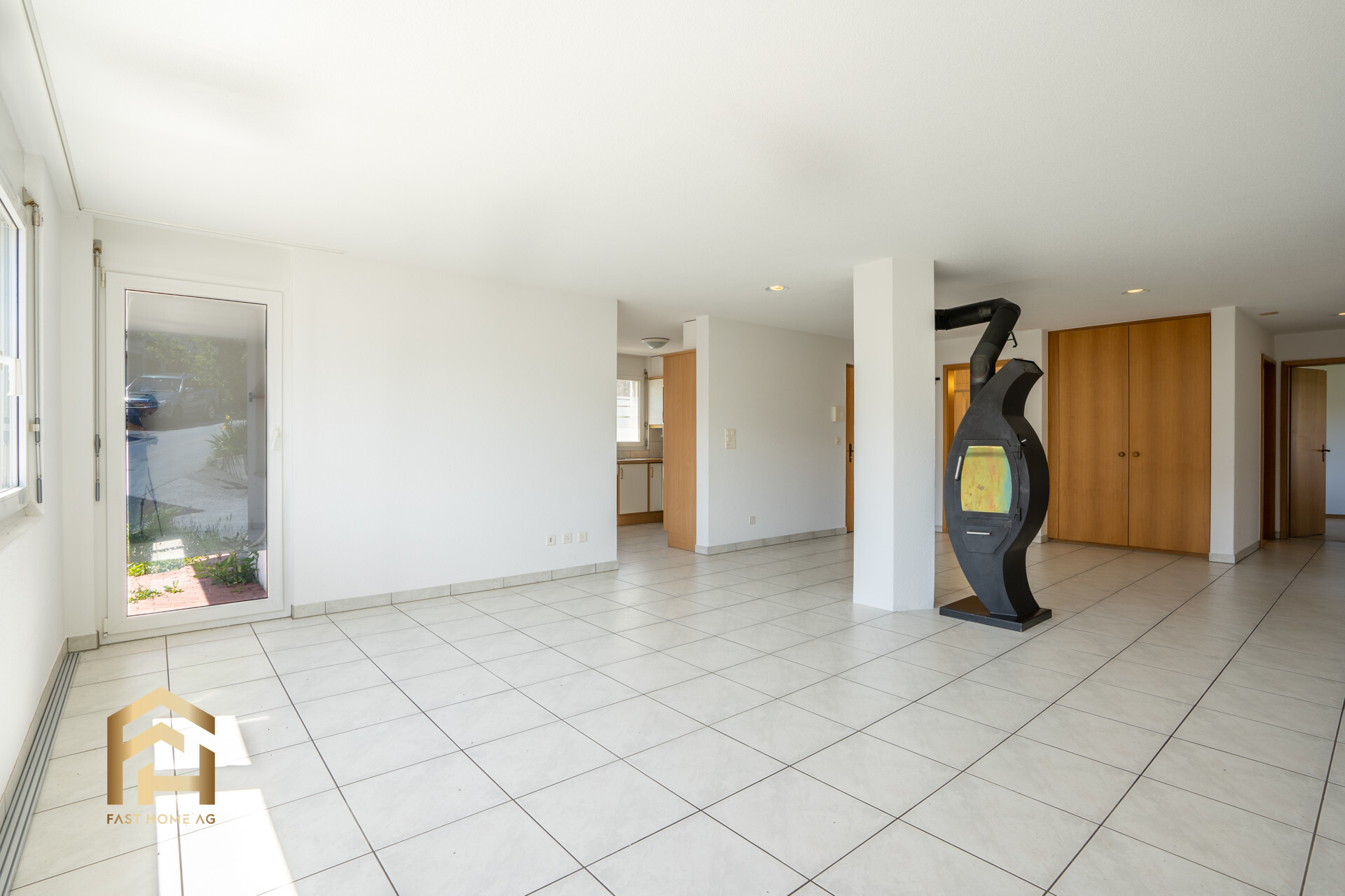 Das grosszügige Wohnzimmer mit seinem modernen schwedischen Ofen sorgt für eine wohlige Atmosphäre und lädt zu gemütlichen Abenden ein. Die robusten Feinsteinzeug-Böden in den Wohnbereichen stehen für zeitlose Eleganz und unkomplizierte Pflege – ideal für den Alltag und das gewisse Extra an Komfort.