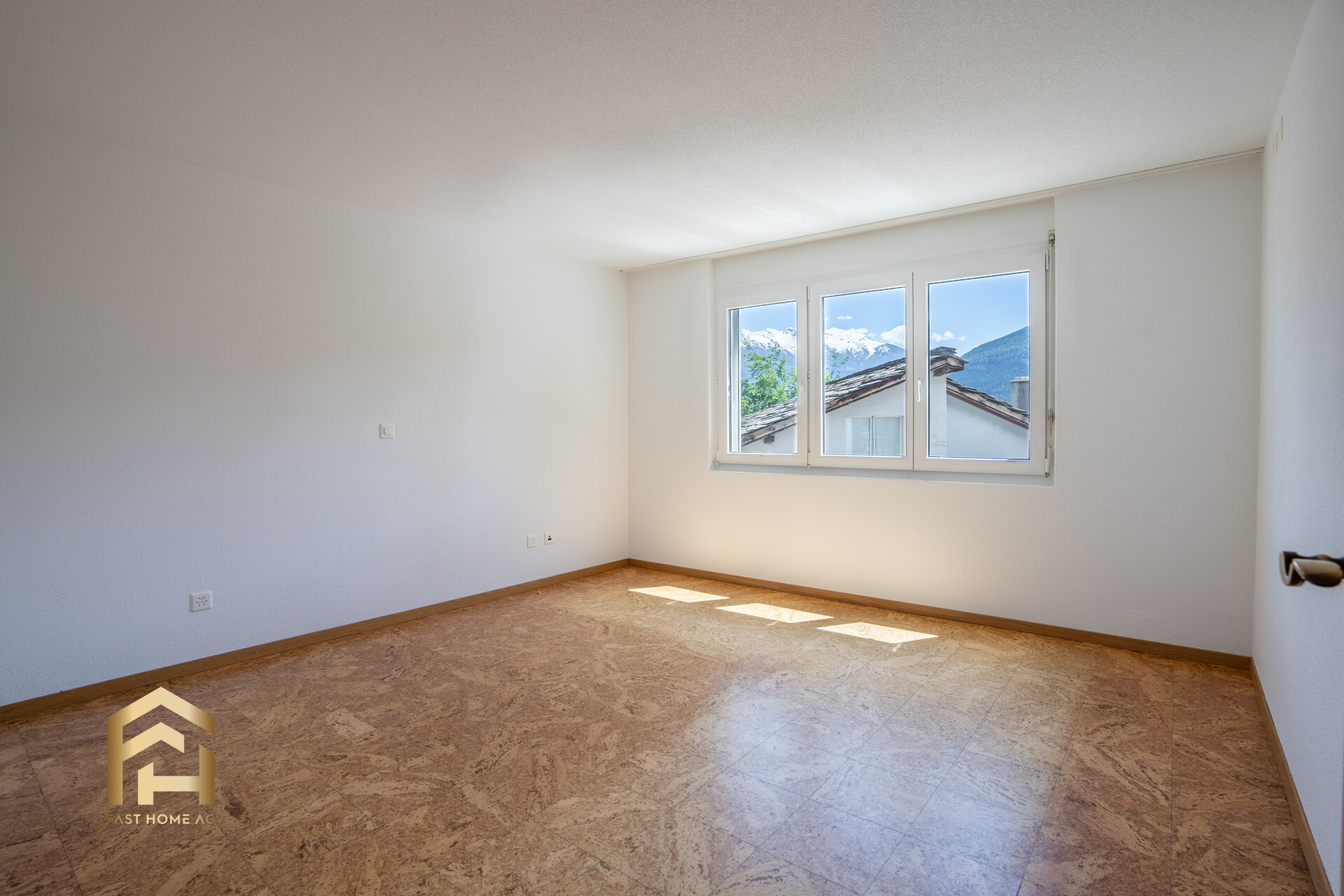 In den Schlafzimmern mit Korkböden trifft Behaglichkeit auf Ruhe. Grosse Fenster eröffnen einen weiten Blick auf die umliegende Berglandschaft und schaffen lichtdurchflutete Rückzugsorte voller Geborgenheit.