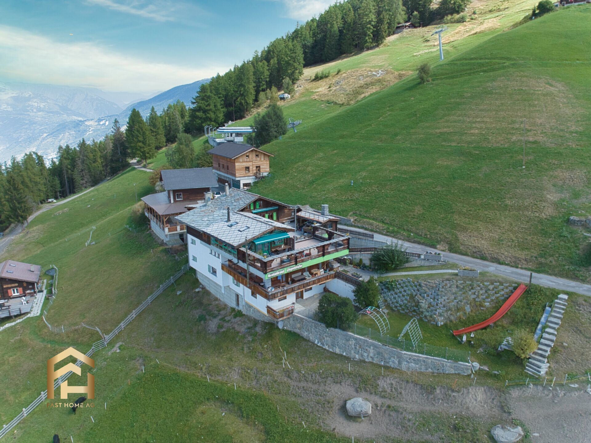 Die Küche des Restaurants ist optimal ausgestattet und in eine Warm- und eine Kaltküche unterteilt. Hier können Sie Ihre Gäste mit traditionellen Walliser Spezialitäten verwöhnen. Dank ausreichend Lagerfläche sowie zwei großen Einbaukühlschränken steht genügend Platz zur Verfügung, um Ihre Vorräte optimal zu bewirtschaften. Der Holz-Raclette-Ofen mit Wasserkühlung im Restaurant sowie der Grill auf der Terrasse bieten dem kreativen Koch zusätzliche Möglichkeiten, um kulinarische Highlights zu zaubern. Auf der Südseite des Gebäudes steht der grosszügig gestaltete Kinderspielplatz. Hier können die kleinen Gäste sich austoben.